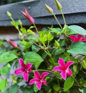 (1) Clematis texensis ‘Princess Diana – I love the vibrant tulip-shaped cerise pink flowers & healthy dark green foliage (& it’s an American variety 🇺🇸🤩). I’ve only ever seen it once before, many summers ago, looking spectacular in an allotment at the wonderful #ludlowopengardens. It has an RHS Award of Garden Merit, as it’s such a reliable clematis.