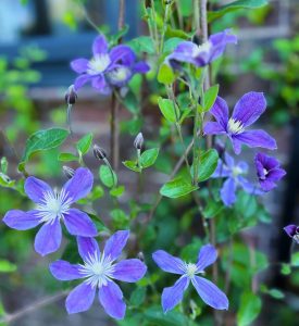 (2) A young Clematis viticella ‘Etoille Violette’ looking pretty growing up a rusty obelisk in a west-facing flower bed. Its regal purple flowers continue for ages with regular dead-heading. This clematis also has an RHS Award of Garden of Merit & is beloved by many a gardener.